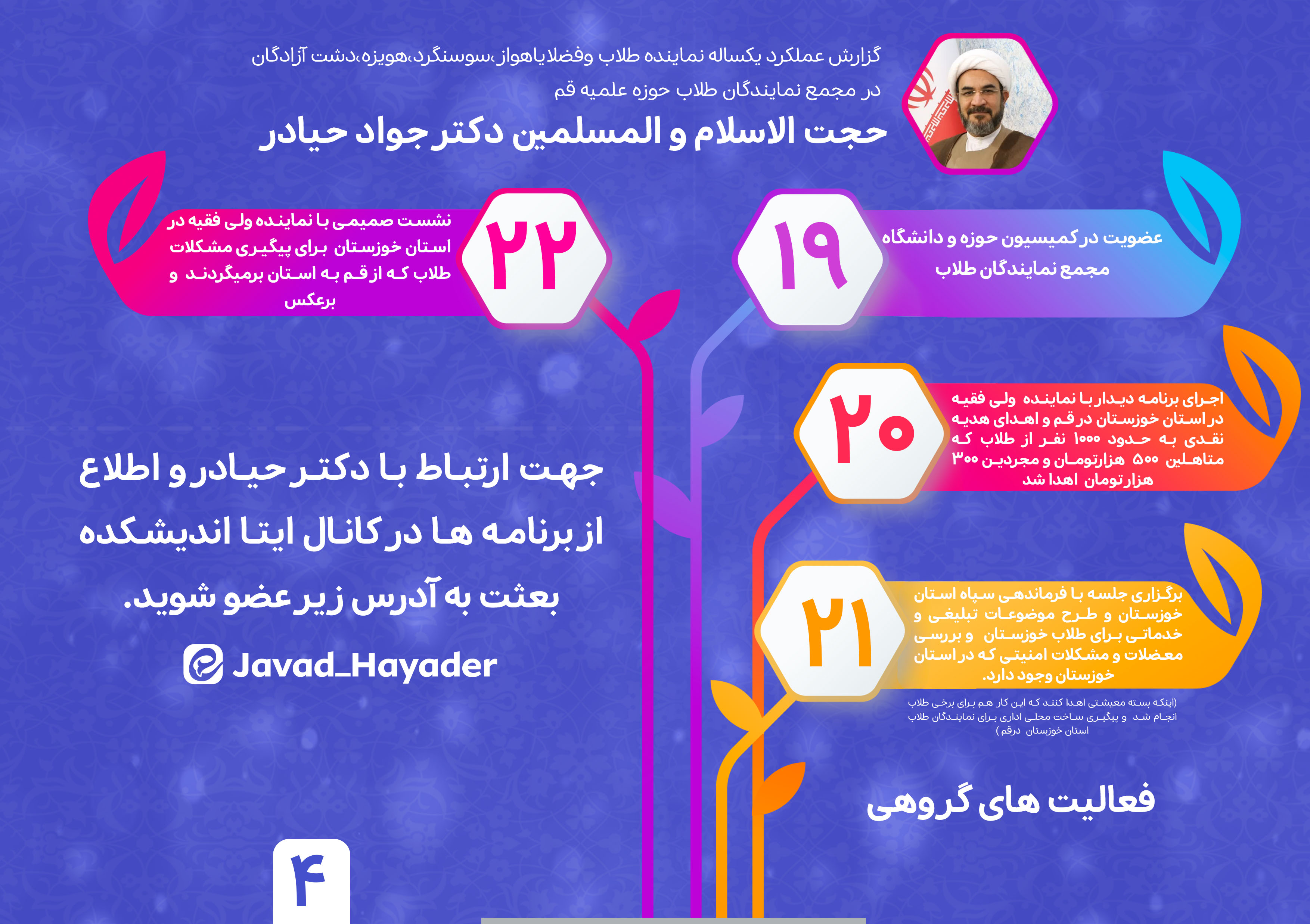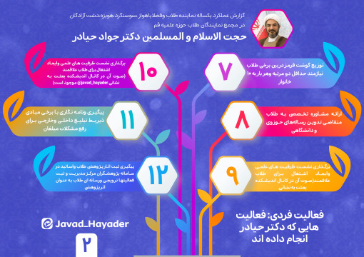 تبلیغ در دانشگاههای کشور، مساجد، کشورهای خارجی (ساحل عاج، عراق، سوریه)، فضای مجازی، و آستان قدس رضوی، با سابقه 20 ساله.